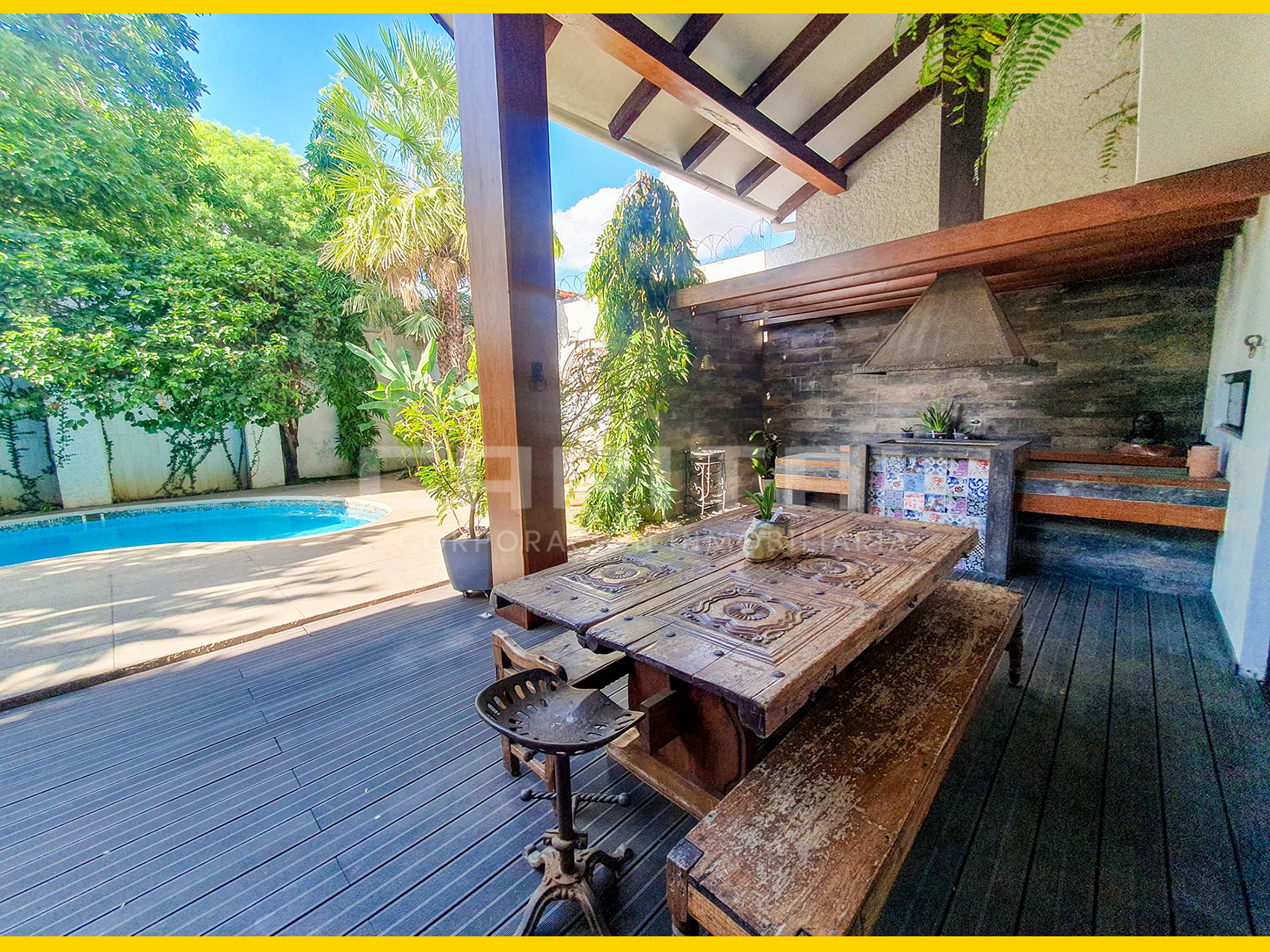Galería con techo alto con piso deck