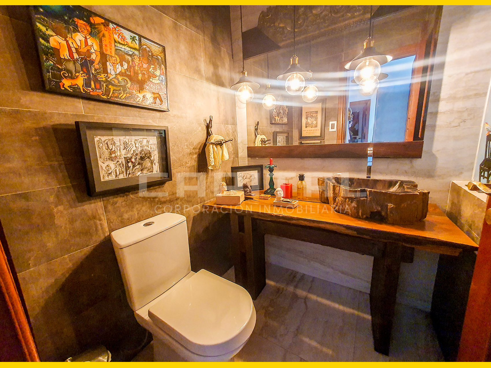 Baño de visitas con lavamanos con tronco fosilizado