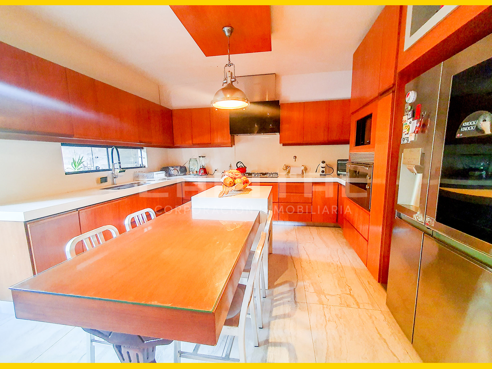 Amplia cocina equipada con cajonería alta y baja, isla, comedor de diario y despensa
