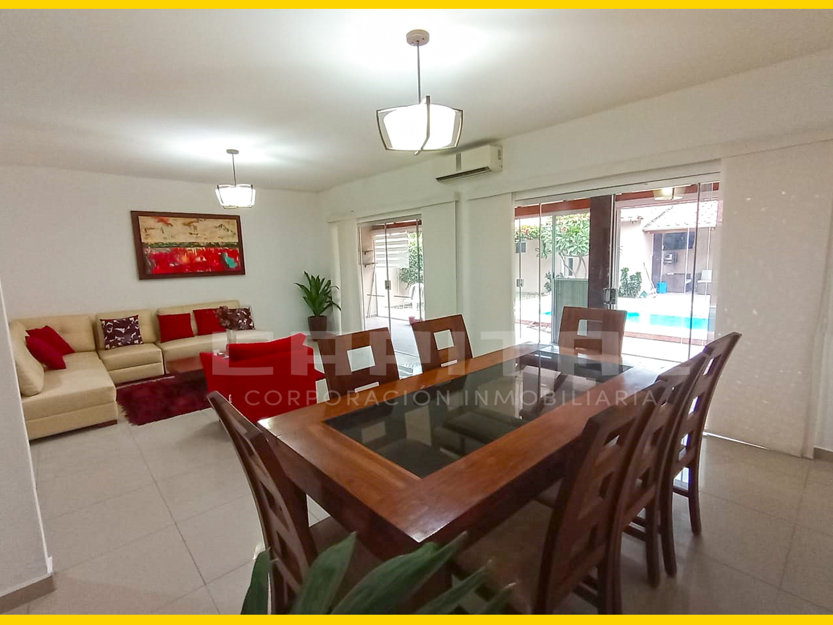 La vivienda cuenta con equipamiento de primera, 7 aires acondicionados, cortinas y pantallas en todos los ambientes