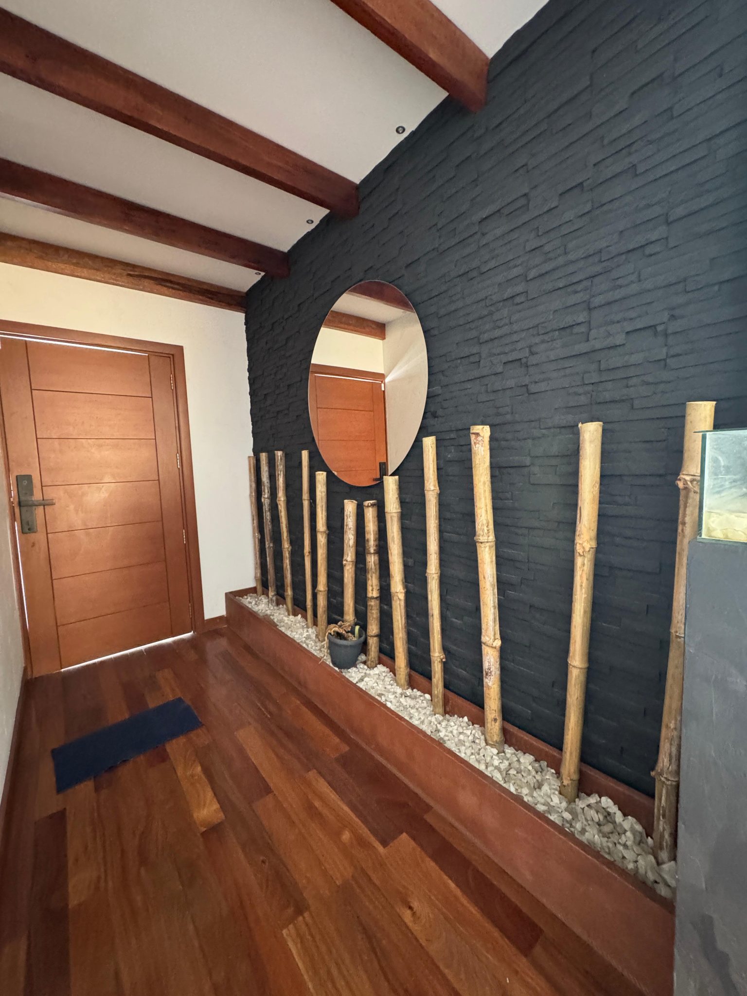 🌿 Sala de meditación con jardín seco y sillón columpio.