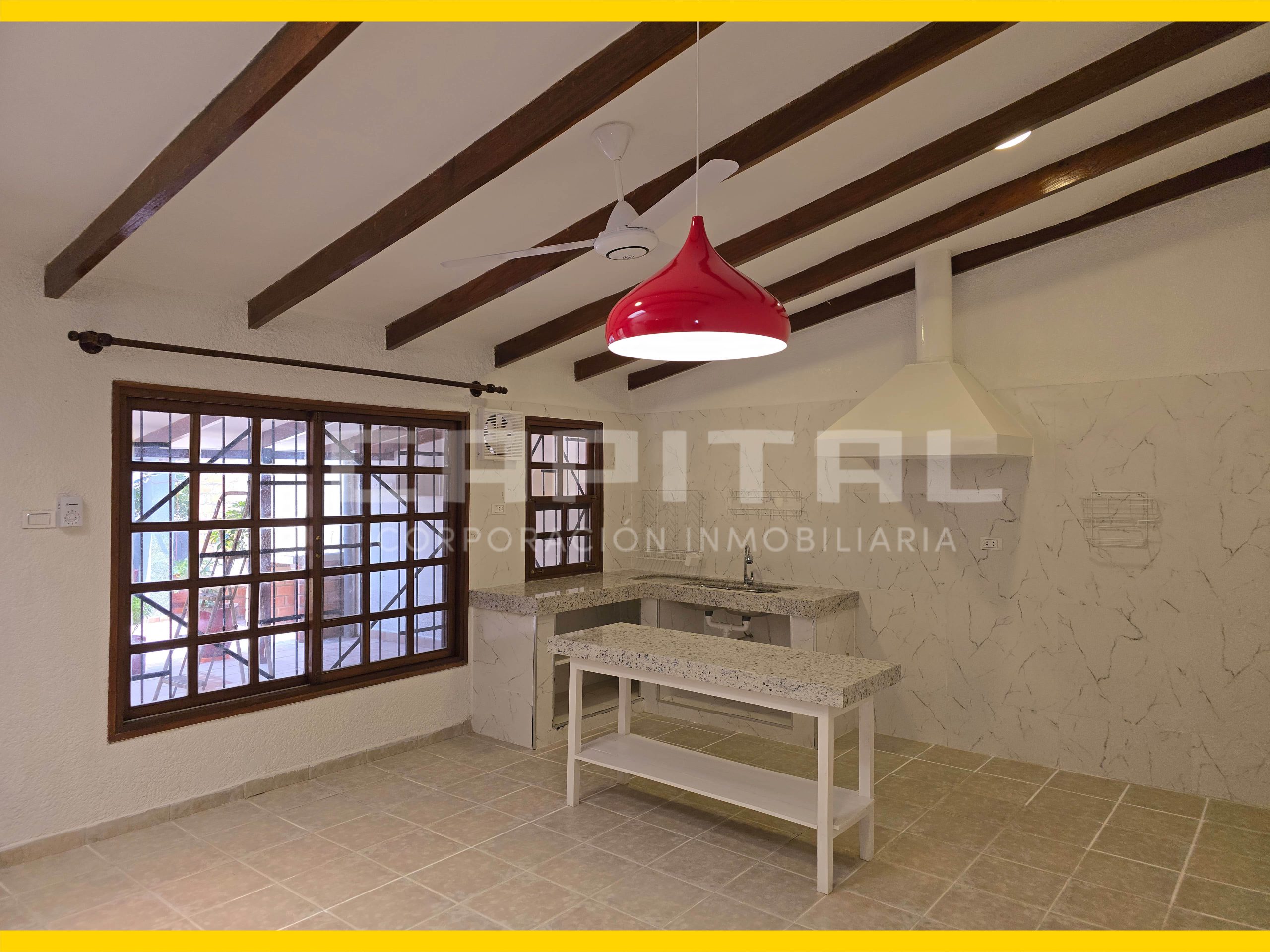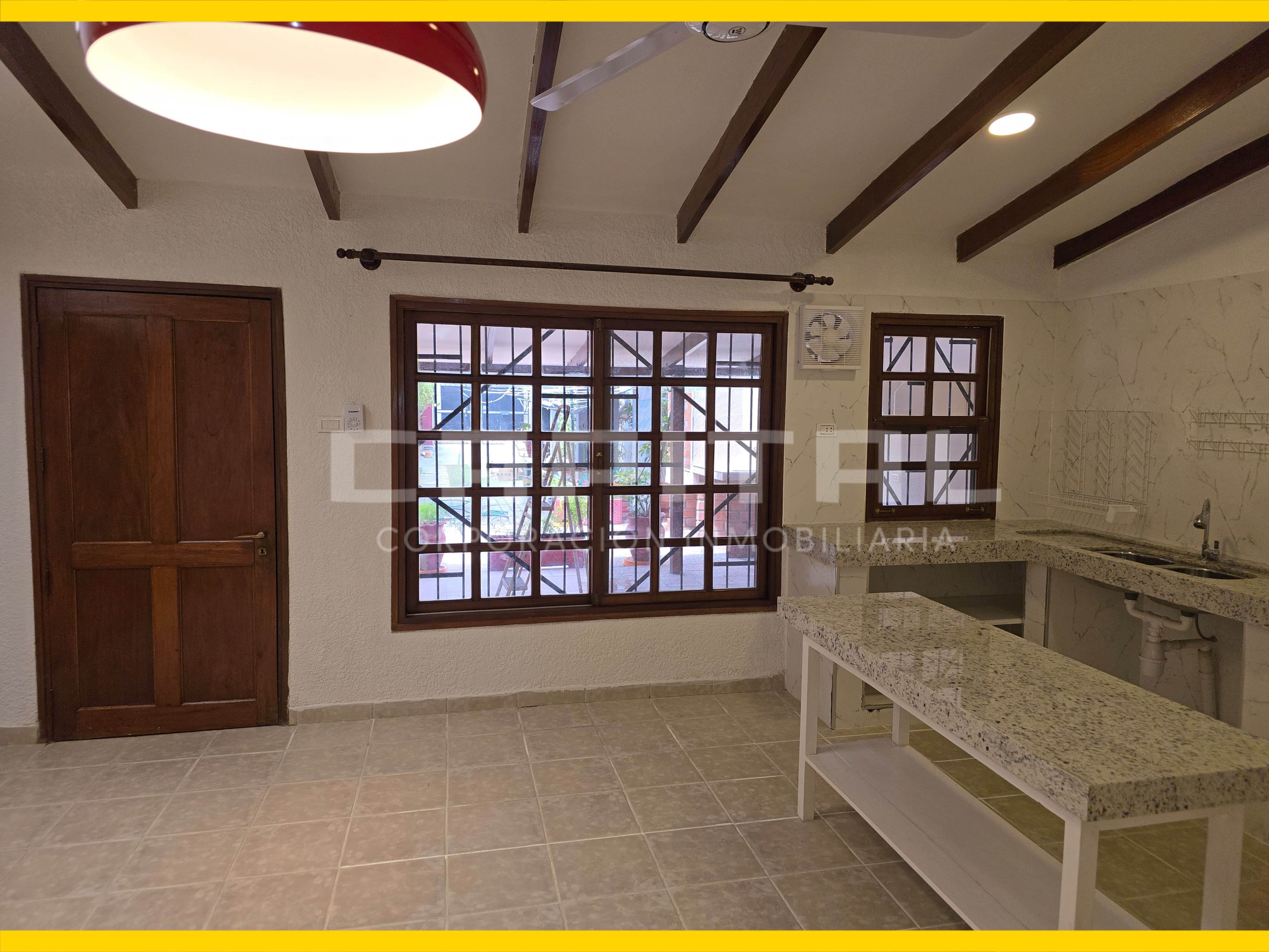🟢 Cocina integrada con sala amplia, mesón de granito, mueble desayunador estilo americano, extractor, campana, tragaluz y ventilador de techo.