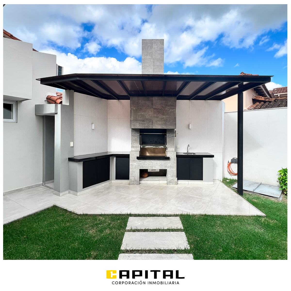 * Churrasquera con muebles empotrados y lavaplatos.
