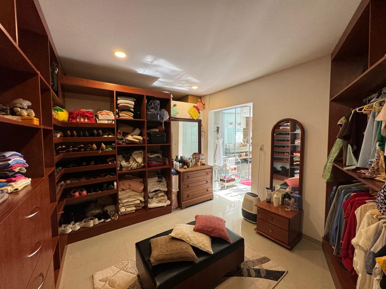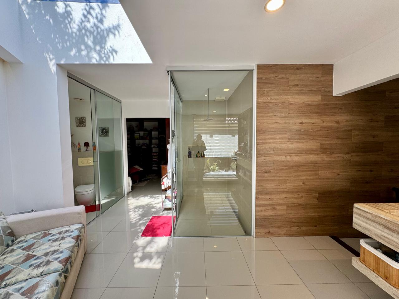 un baño moderno, techo de vidrio, walking closet y box de baño con moderna ducha.